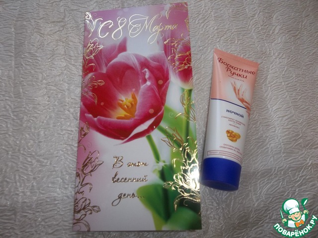 Это крем для рук,мне очень нравятся "бархатные ручки" и красивая открытка с поздравлениями.