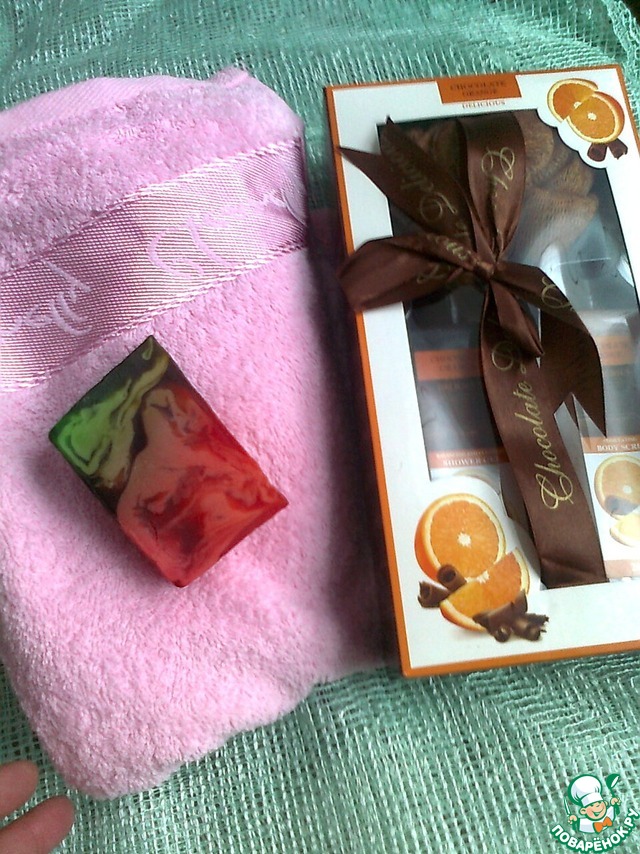 А это все для принятия душа: полотенечко, набор для душа и мыло, изготовленное ручным способом, от него идет такой обалденный аромат!