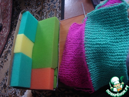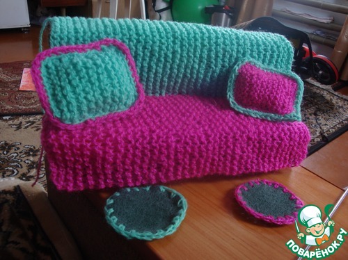 Приклеила внутрь губки. Связала верхнюю часть дивана лицевыми петлями и приклеила