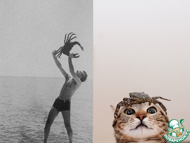 Какие у сиамочки невероятно голубые глаза... И с крабом... Бедняжка, посадили монстра прямо на голову, бяки....