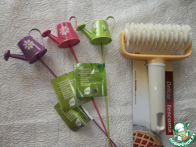 А это ролик для нарезки сетки(у меня такого не было) и очень симпатичные декоративные леечки разных цветов!!!! Теперь украшу свои цветы.