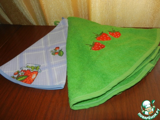 Яркие, интересные полотенечки. С клЮбничками махровое и круглое, а кухонное вафельное полукругом