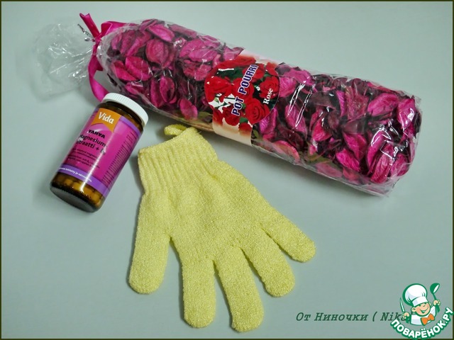 Массажная перчатка,витаминно-минеральный комплекс и лепестки роз!