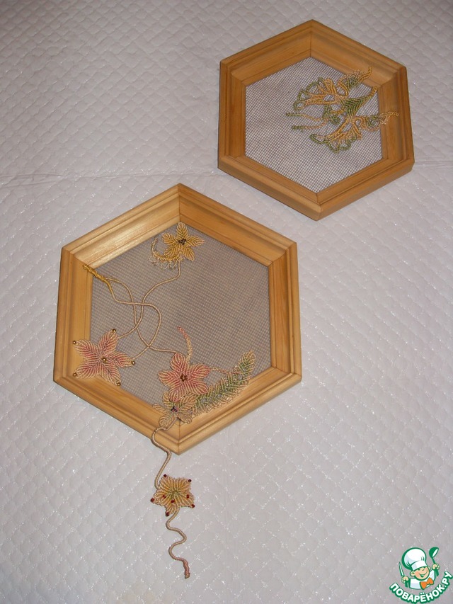 Еще одно панно в подарок. В верхней рамочке бабочка в стиле макраме, которая летит на цветочки в нижней рамке.