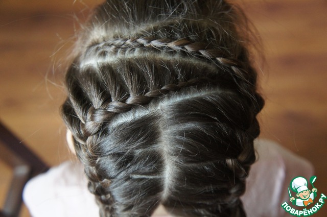 Субботняя прическа. Две односторонние французские косички, которые переходят в простые двухсторонние косички.