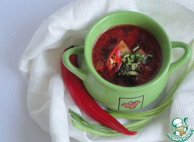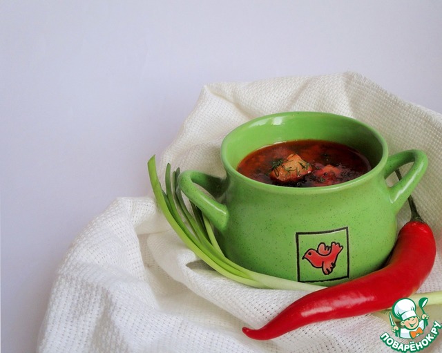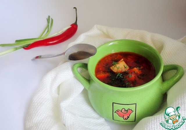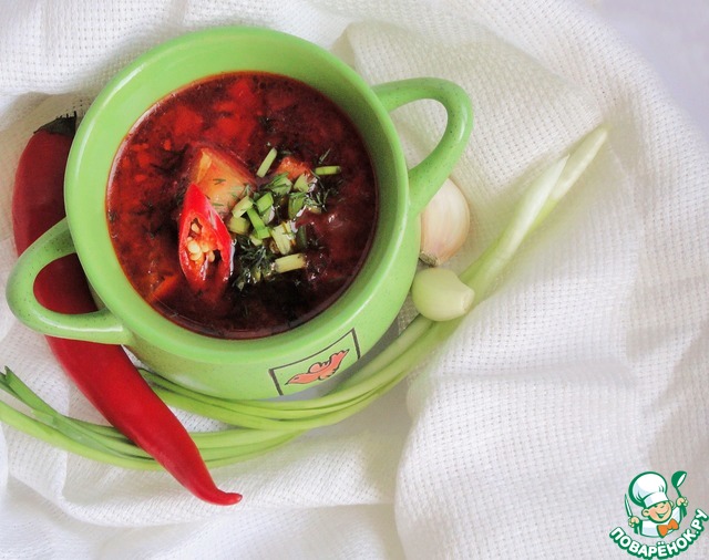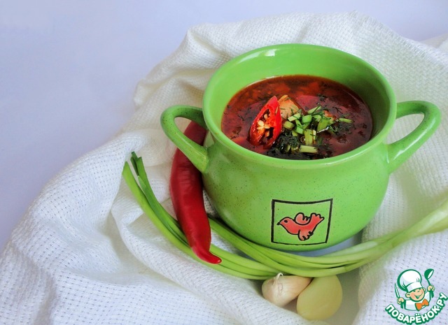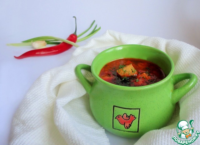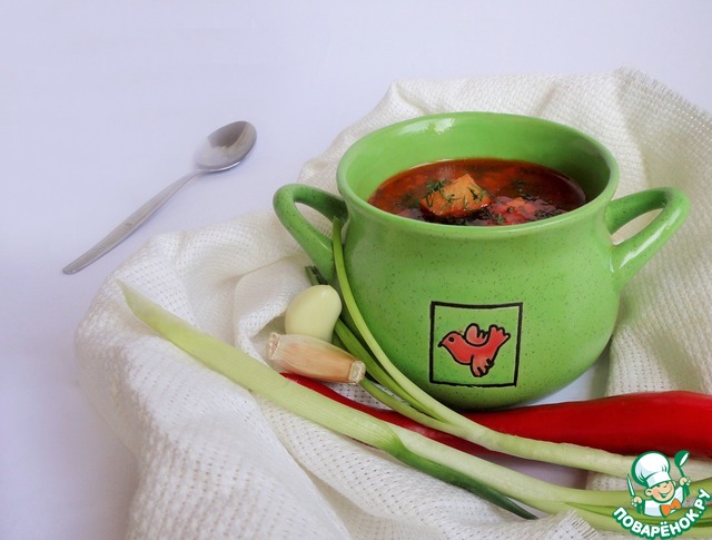 Фотографировала на ватмане, на котором уже было сделано куча кулинарных фоток, от того на нем осталось много пятен. А покупать для каждого фото новый ватман я сейчас не совсем в состоянии, тем более, что все можно решить с помощью ФШ. Часть пятен закрывала стандартными офисными листами А4. Часть подтирала фотошопом. Точно также "подтирала" редактором стыки между листами бумаги, дефекты на перчике, еще "подтерла" следы борща на миске (как ни старалась подтереть салфеткой, все-равно оставались или появлялись снова при перемещении мисочки для разных ракурсов) и малость корректировала цвета, чтобы фото было ярче.