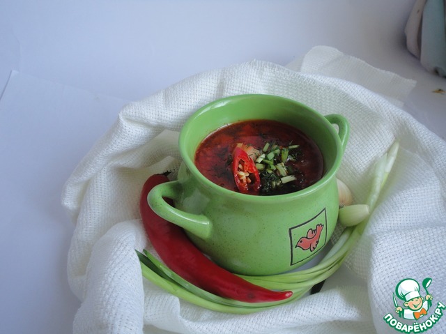Фотографировала на ватмане, на котором уже было сделано куча кулинарных фоток, от того на нем осталось много пятен. А покупать для каждого фото новый ватман я сейчас не совсем в состоянии, тем более, что все можно решить с помощью ФШ. Часть пятен закрывала стандартными офисными листами А4. Часть подтирала фотошопом. Точно также "подтирала" редактором стыки между листами бумаги, дефекты на перчике, еще "подтерла" следы борща на миске (как ни старалась подтереть салфеткой, все-равно оставались или появлялись снова при перемещении мисочки для разных ракурсов) и малость корректировала цвета, чтобы фото было ярче.