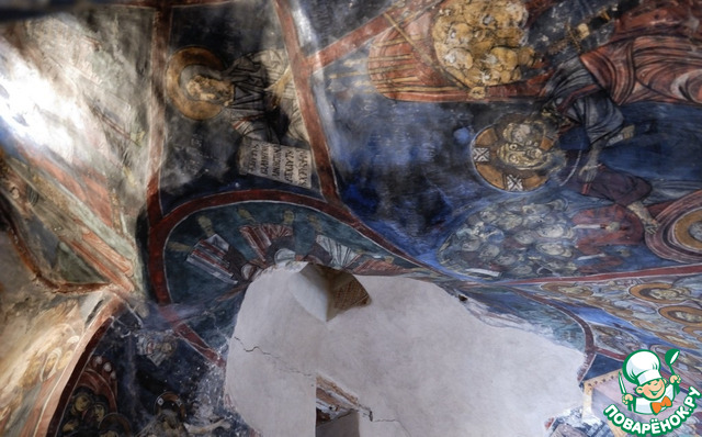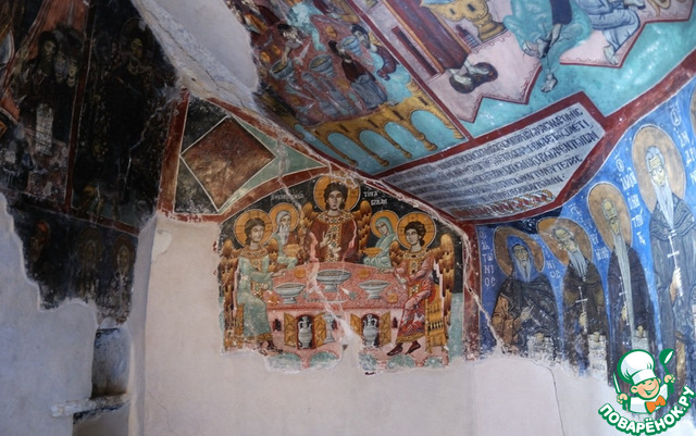 Некоторые фрески, которые мы там увидели, создавались ещё при жизни Неофита. Например, эта, на которой он изображён между архангелами Михаилом и Гавриилом, удерживающими его за плечи.