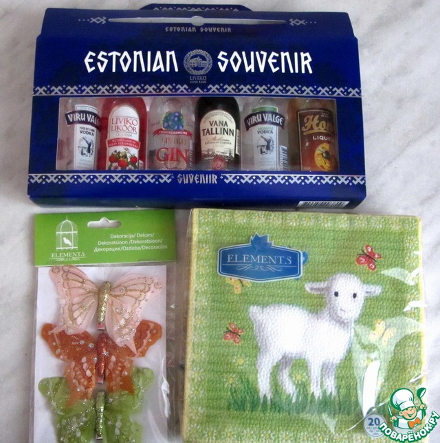 И сегодня я его получила - шикарный набор из шести алкогольных напитков, а кроме того декоративные бабочки и милейшие салфетки.