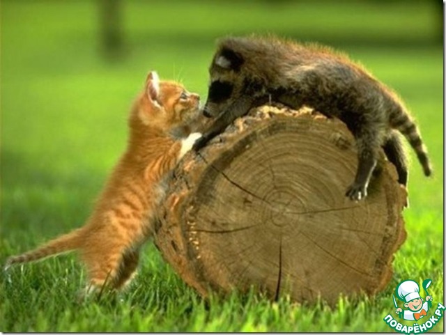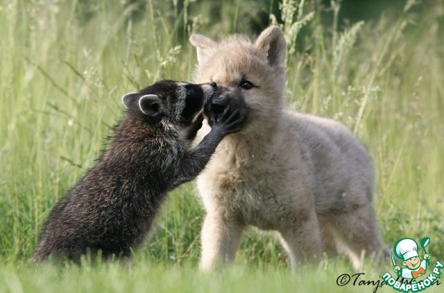 Представьте себе: вагончик между клетками с животными ра3делен металлической стеной, а лицевая сторона, та, которая к 3рителю – решетка. И вот во3ле этой решетки стояло у волка корытце с молоком и енот, просунув лапу вперед-налево-на3ад и вни3, шлепал по корытцу лапкой, потом вытягивал ее обратно и сли3ывал молоко! Это было так 3абавно и грустно одновременно, что любовь моя родилась бе3условно и на всю жи3нь…….