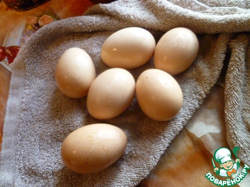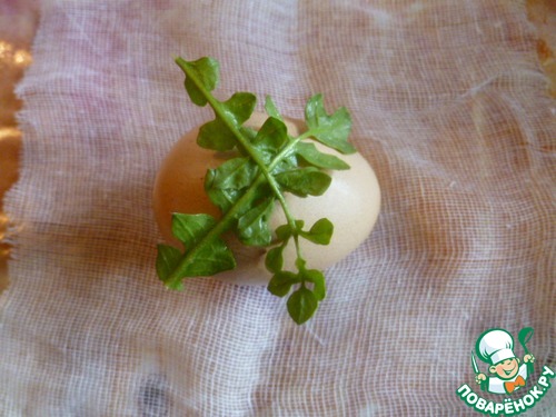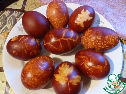 В остывший луковый отвар кладем подготовленные яйца и варим 15 минут. Дать яйцам остыть в отваре, затем вынуть, снять марлю, листики или рис.