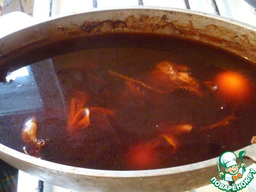 Итак, приступим.Сначала сварим луковую шелуху. Для этого шелуху залить водой( шелухи должно быть в два раза больше, чем воды), довести до кипения и проварить 1 час. Остудить.