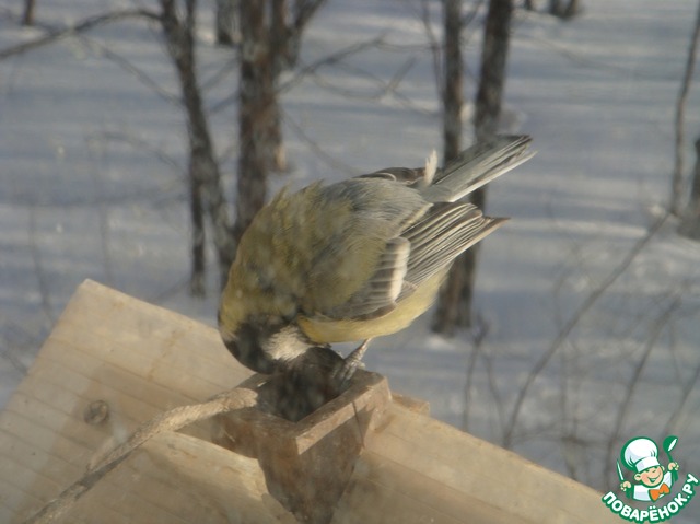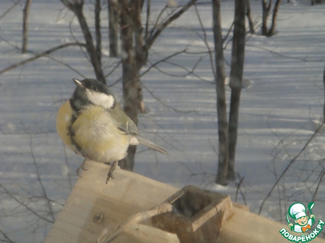 Это - наша любимица.Все синички берут семечки в кормушке-домике и летят на веточку и там грызут.А наша красотка на веревочке,которой привязана кормушка,любит долбить.А,если с вечера не насыпать в кормушку,то утром она стучит в окно:что вы там спите,давайте,кормите!