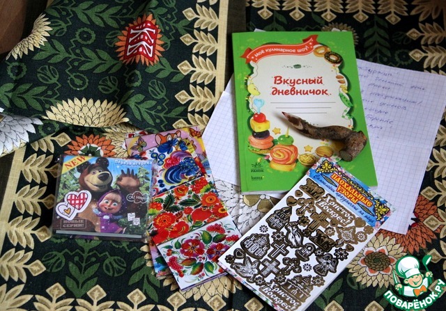 От Машеньки мария ольховская http://marija-olhovskaja.povarenok.ru/ и её семьи пришло вот такое душевное поздравление прямо накануне праздника: набор шикарных пасхальных скатертей и салфеток, блокнотик и замечательный карандашик в виде деревянной трубки (нет его на фото, убежал) для Насти, украшения для пасхальных яиц и кулинарный дневник (на случай "перестройки" сайта и недоступности онлайн рецептов)