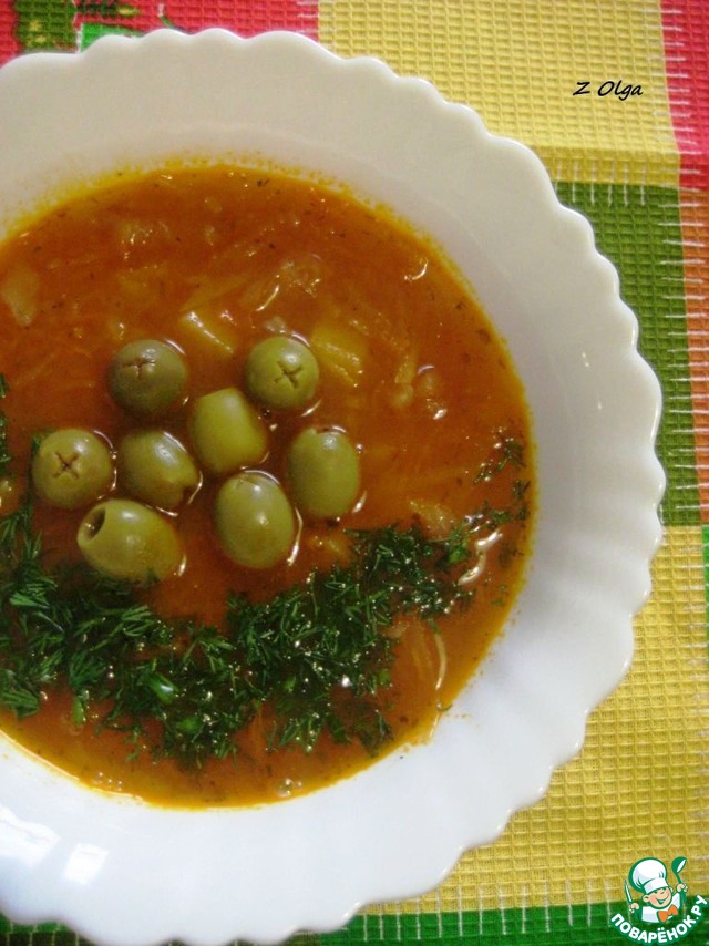 "Постная солянка с капустой" от поваренка Анна Шумилова https://www.povarenok.ru/recipes/show/87524/ Вкусная получилась солянка! Благодаря этому рецепту я узнала, что мой кот ест оливки, при чем рычит при этом если бы это было мясо.
