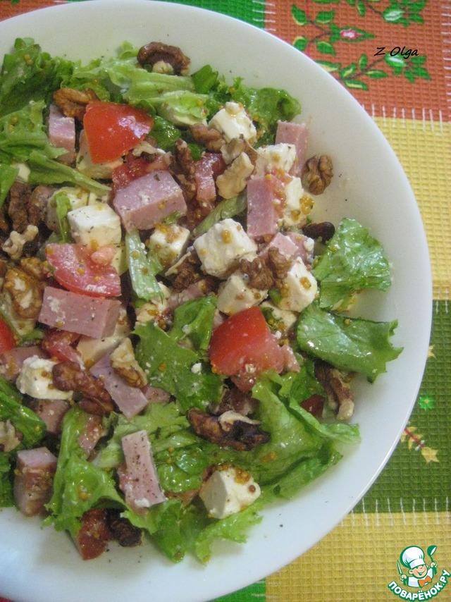 "Салат с голубым сыром и ветчиной" от поваренка farfalla https://www.povarenok.ru/recipes/show/88950/ Голубой сыр я заменила фетой, так я была уверена, что кое-кто не будет крутить носом и обязательно его съест