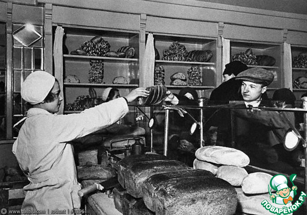 А продавщицы в гастрономе держали огромные кирпичи ржаного поближе, ведь его покупали больше всего. Вы на ножичек для хлеба внимание обратите. Которым она порцайки весового ржаного покупателям отрезает. Меч-кладенец настоящий! Ведь один ржаной хлеб в те годы был размером с девичье туловище. Фото1935г.