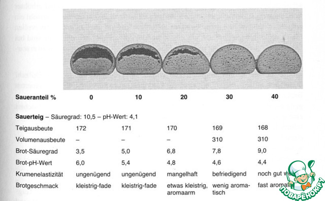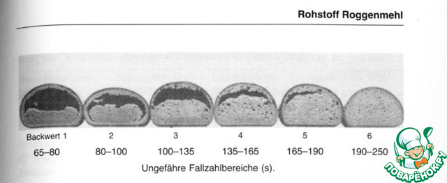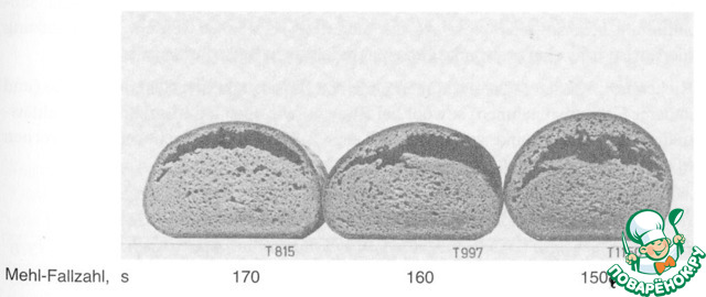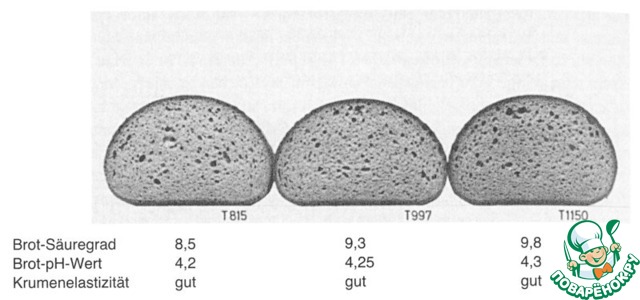 Так, что привожу иллюстрацию разного мякиша ржаного хлеба на дрожжах, без кислоты и заквасок, без соли, то есть с высоким рН, как у белого хлеба, как у парного молока, в зависимости от числа падения муки из немецкого учебника.