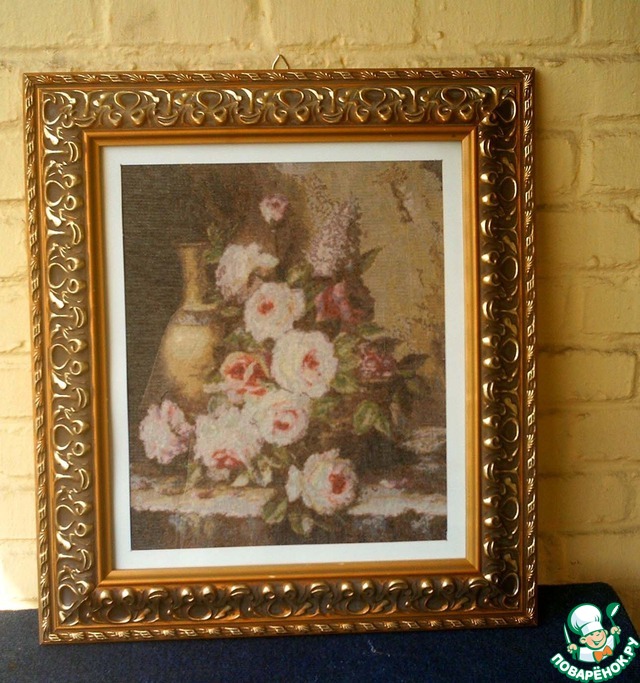 Моя последняя работа. Некоторое время пришлось ей полежать в шкафу, потом купили мы вот эту рамку по дешевке, потому что в багетной мастерской просто ошалеть можно, какие цены. Вот, сами натянули, паспарту из хорошего картона - и очень даже неплохо получилось.