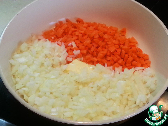 Лук и морковь нарежьте мелкими кубиками. На сковороде разогрейте 20 гр. сливочного масла, добавьте 1 ст. ложку растительного масла. Положите подготовленные овощи и жарьте до золотистого цвета.
