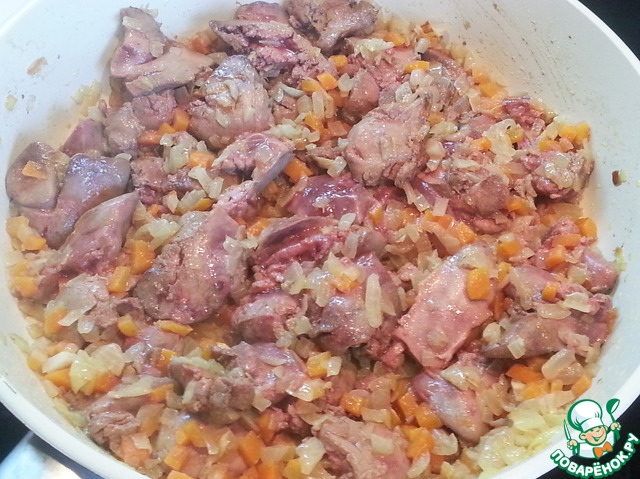 Добавьте на сковороду крупно нарезанную печень и готовьте 5 минут, постоянно помешивая. Посолите, поперчите и посыпьте 1 ст. ложкой сахара. Пережаренную печень с луком и морковью переложить в тарелку, дать остыть.