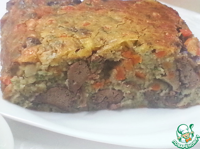 Яйца, растительное масло и разрыхлитель соедините и слегка взбейте вилкой. Добавьте теплое молоко и сыр, перемешайте. Введите просеянную муку. Положите зелень и остывшую печень с овощами. Посолите и аккуратно перемешайте ложкой.