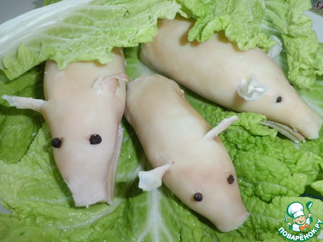 Это мои первые поросята,так что дико извиняюсь перед автором и всеми Вами за их внешний вид...ну вот такие "страшненькие" получились (стыжусь)))) Но это самые вкусные фаршированные кальмары,которые я пробовала... Начинка 100% моя по вкусу!!!! Правда фасоль я тоже отправила во внутрь и брала смесь дикого и пропаренного риса... Буду повторять однозначно именно с этим "фаршем"..))))