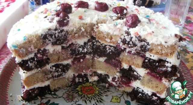 По этому рецепту собирала в "шахматном" порядке торт, дополнительно прослоила коржи вишней с соком. Пекла на даче, поэтому украшен по-домашнему.