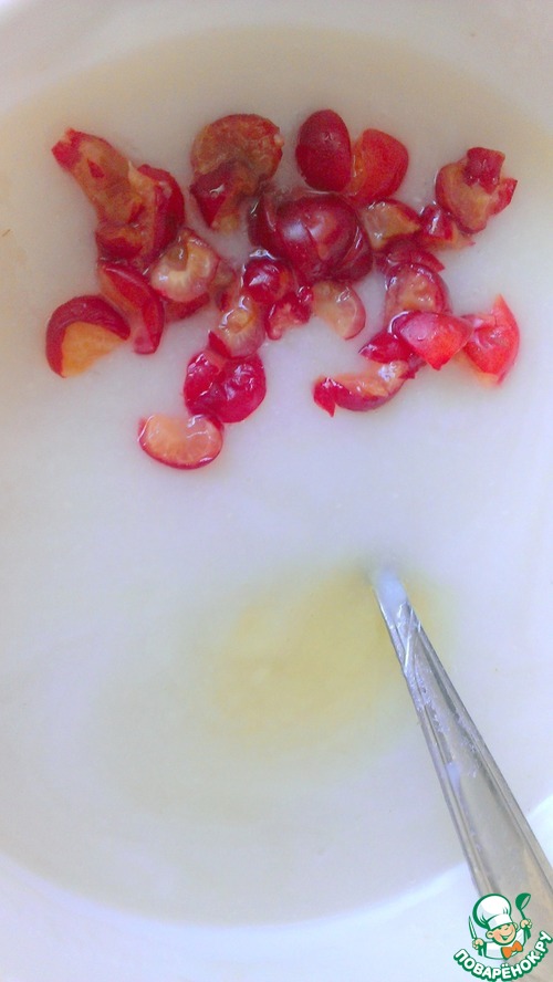 Смешиваем рисовое молоко с сиропом, добавляем немного оливкового масла, вишню и перемешиваем.