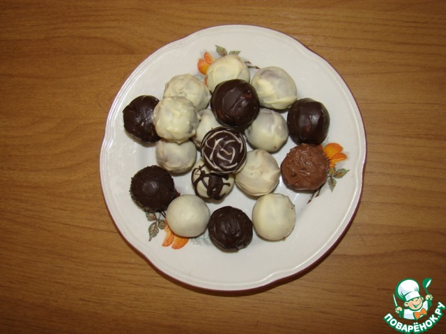 Очень простой рецепт, но получаются бесподобные конфетки))) [cut] Очень мне понравился процесс покрытия шоколадом))) Сначала следовала рецепту, окунала теплыми в жидкий шоколад, получалась гладкая глазурь, а потом решила немного отступить))) Охладила шарики и шоколад стал быстрее густеть на конфете, а я при помощи чайной ложки и зубочистки "измывалась" над конфетами))) Обязательно приготовлю их еще в ближайшем будущем в качестве подарка)))