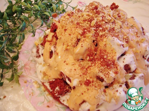 - а в остатки крема добавила пару ложек вареной сгущенки, и полила сверху тортик.