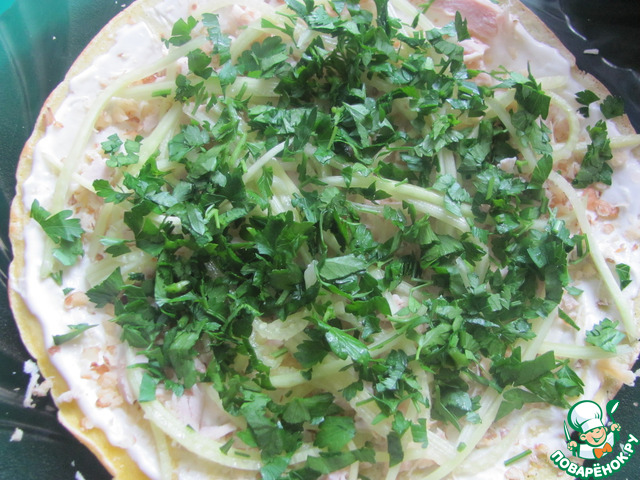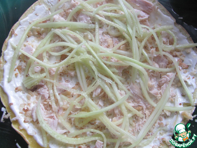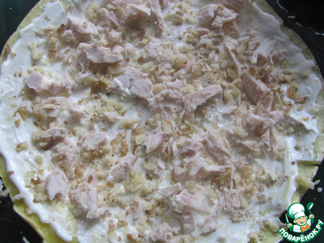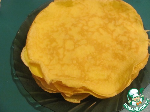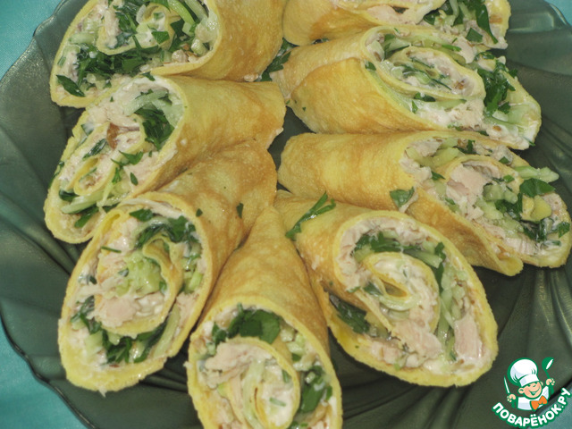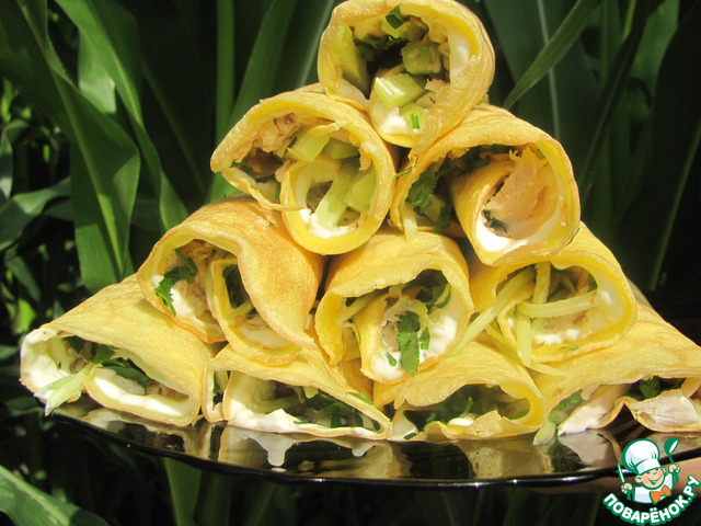 Итак, 5 яиц взбить с 5 ст л майонеза, посолить и добавить 5 ст л без горки муки испечь блинчики тонкие, сковородку смазать только в начале. Получается 10 больших блинчиков