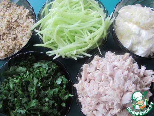 порезать 300 г мяса, у меня грудинка. натереть на терке орехи 10 шт., 250 г майонеза смешать с 4 зуб чеснока, огурец натереть на корейской терке или соломкой. петрушку помыть и порезать мелко