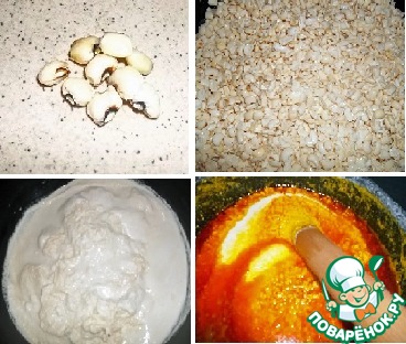 Фасоль берется строго определенного сорта, маленькая белая с «черным глазком». Ее замачивают в большом количестве воды на ночь.Теперь самое трудное: нужно очень тщательно очистить фасоль (перетирая руками) от белой пленочки и от «черных глазков», меняя воду несколько раз. Очищенную фасоль измельчить до получения однородной пасты с 1 перчиком чили для любителей (я перец вообще не ем, но здесь добавляю совсем маленький кусочек). Развести фасолевую пасту небольшим количеством теплой воды. Затем нагреть красное пальмовое масло. Да, знаю, много идет споров о пользе и вреде этого масла, но я считаю, что в наше время можно найти вред любому продукту, особенно если им злоупотреблять. А у меня оно как говорится из первых рук (из деревни привозят) и использую я его очень редко, ну например, очень вкусная с ним получается простая тушеная фасолька). Итак, разогретое масло добавить в пасту и все хорошо перемешать деревянной лопаточкой.