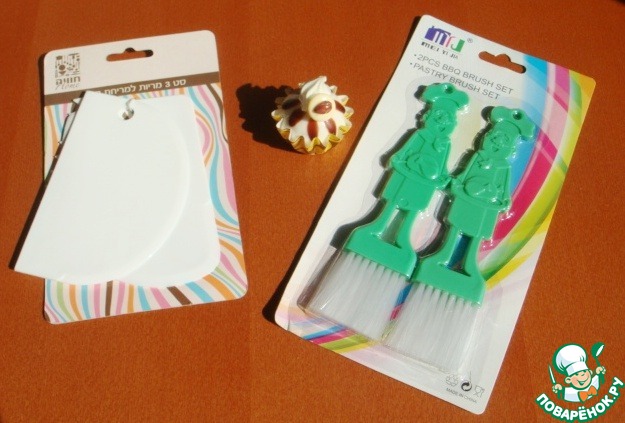 А это кисточки с такими веселыми поварами,очень милый магнитик в виде пирожного и три лопатки ,которые позволят ровно и красиво украсить кондитерские изделия.