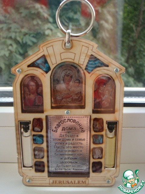 А это Икона с благословением дома из Иерусалима,которую изготавливают только на Святой Земле. Качественное цельное дерево, узорчатые ниши наполненны россыпью полудрагоценных камней. Под ликами текст благословения, бутылочки, в них Святая вода из реки Иордан и Освященное оливковое масло !Это - просто бесценный подарок!