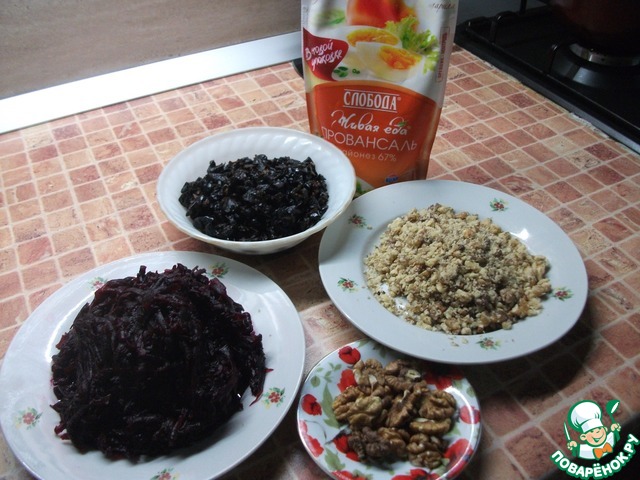 Подготовим продукты. Залить промытый чернослив горячей водой. Вареную свеклу натереть на крупной терке. Орехи потолочь в ступке (не сильно), чтобы кусочки орехов чувствовались в салате. Часть орехов оставить для украшения. Распаренный чернослив порезать кубиками. Приготовить майонез. Вот и вся подготовительная работа.