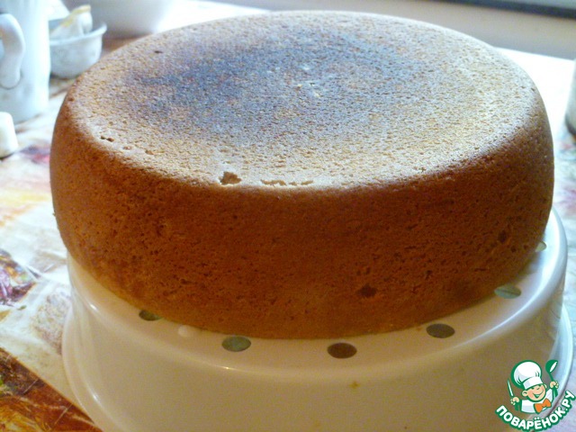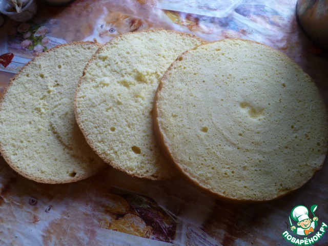 Если бисквит на торт, то нужно дать выстояться ночь, затем ровным ножом разрезать на три коржа.