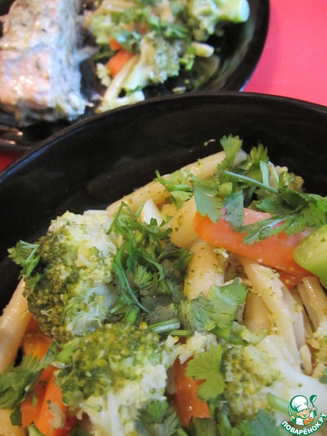 Разогреваем в сковороде растительное масло, добавляем пропущенный через пресс чеснок, добавляем овощи и жарим на среднем огне примерно 3 минуты, помешивая. Солим по вкусу.