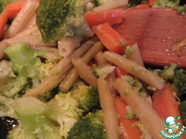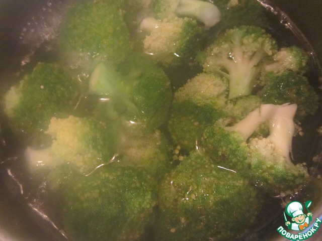 В другой кастрюле - брокколи, разобранную на соцветия, тоже 10 минут. Как брокколи сварится, нужно откинуть её на дуршлаг и облить холодной водой.
