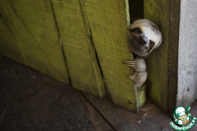 Ленивец выглядывает из плавучего дома в Лаго до Джануари в Манаусе, Бразилия.