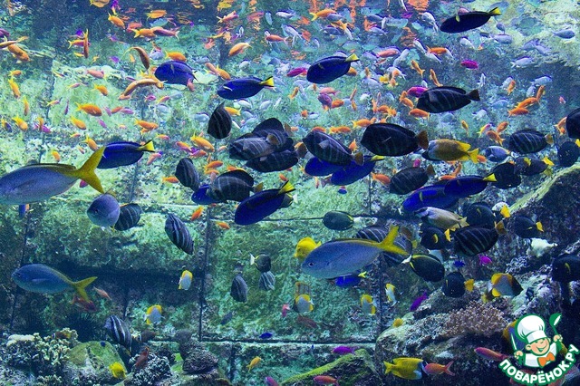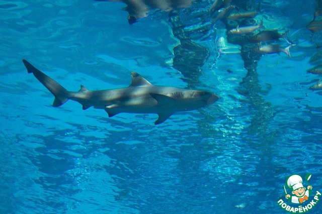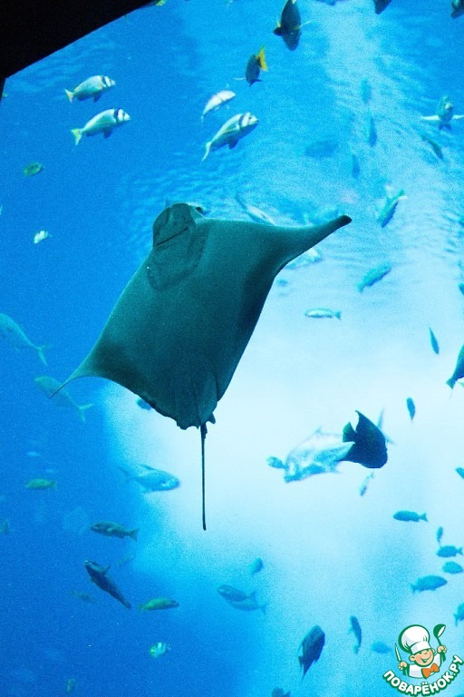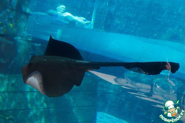 Горка внутри аквариума с акулами, скатами и другими рыбами.. Если присмотреться, то увидите там плывущих людей: