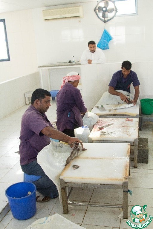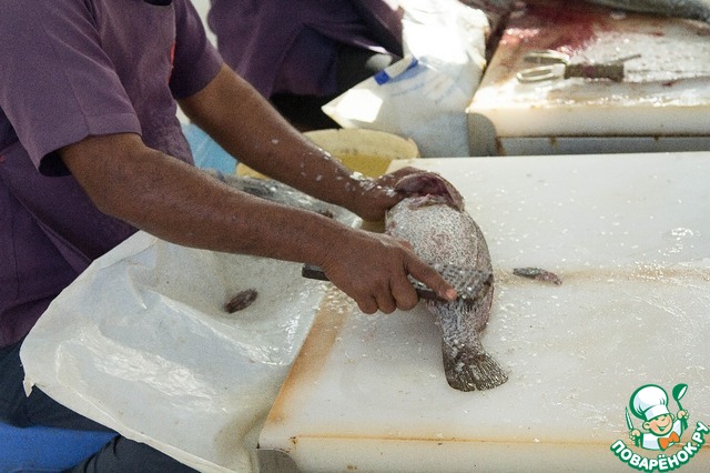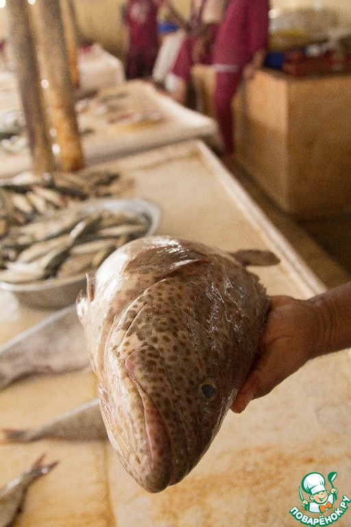 Мы выбрали рыбку Хамур. Хамур всегда являлся самой популярной рыбой для приготовления различных блюд в районе Персидского залива благодаря своим вкусовым качествам, питательной ценности и простоте обработки. Считается одной из самых вкусных рыб в Дубае, есть в меню каждого ресторана Арабских Эмиратов. Мясо бело-розовое, нежное, после готовки тает на языке как сахарная вата. Вот он: