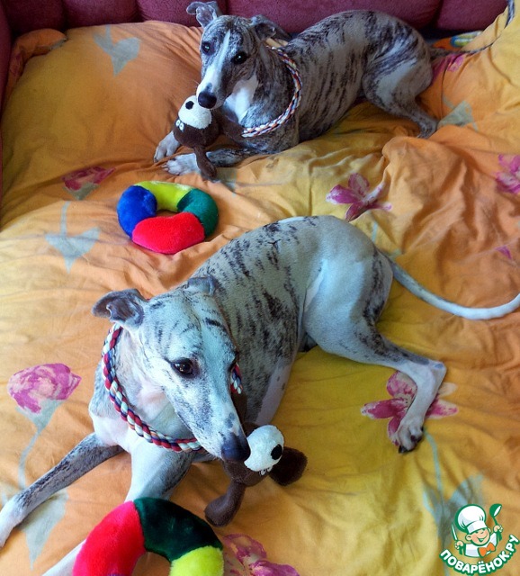 Эти фото я сделала уже после того, как они набегались, напрыгались с новыми игрушками. Теперь отдыхают. Обе части игрушки с пищалками, чего они оочень любят! Ирушеньке нравятся мои собачи и она знает их вкусы!