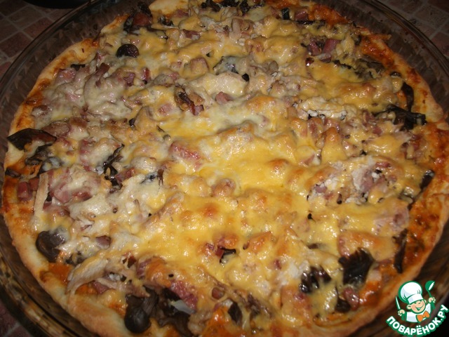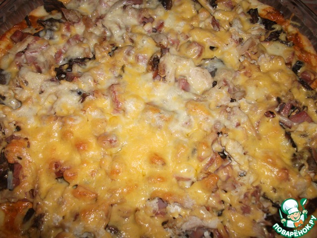 Смазываем получившуюся основу соусом, сверху произвольно выкладываем грибы, лук, ветчину, курицу. Сверху трем на крупной терке сыр.