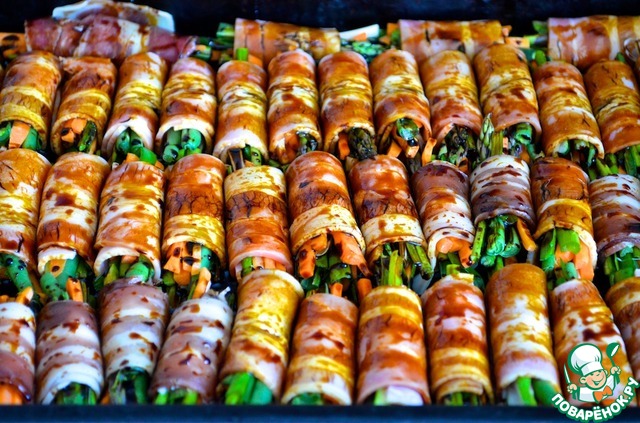 16. Рулеты из бекона и хрустящих овощей, запеченные в меде и соевом соусе.
