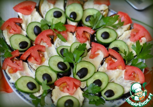 https://www.povarenok.ru/recipes/show/47351/-"Закуска "Павлиний хвост". Очень яркая, вкусная закуска. Решила просто пожарить баклажаны, но мне кажется так они смотрятся намного веселее и красивее. От рецепта конечно отошла,взяла лишь основную идею. Мне понравилось, отличное украшение стола!
