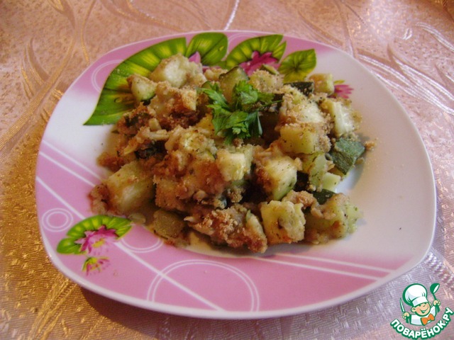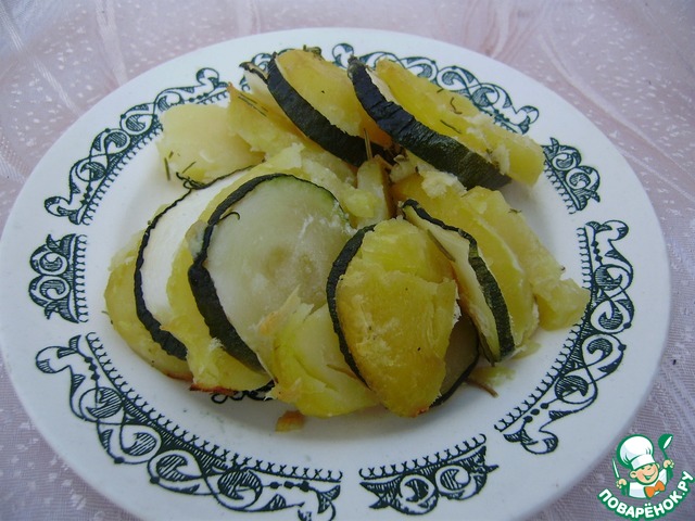 Вкусный гарнир. Блюдо получилось ароматное и нежное.Только хлопотно подбирать кружочки картошки и кабачка одного размера.
