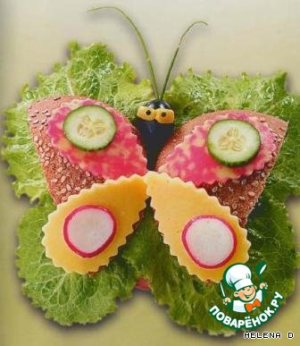 Вам потребуется: 1 булочка, 1 ломтик ветчины, 2 ломтика сыра, 1 черная маслина без косточки, 1 зернышко кукурузы, 2 икринки, 2 кружочка огурца, 2 кружочка редиски, 4 листа зеленого салата, 1 веточка петрушки, сливочное масло или майонез.