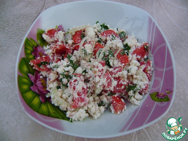 Очень вкусный салат. Помидоры с творогом просто созданы друг для друга. Масло не добавляла. Делала еще с чесноком вместо лука, муж так больше оценил. А мне нравятся 2 варианта.